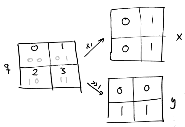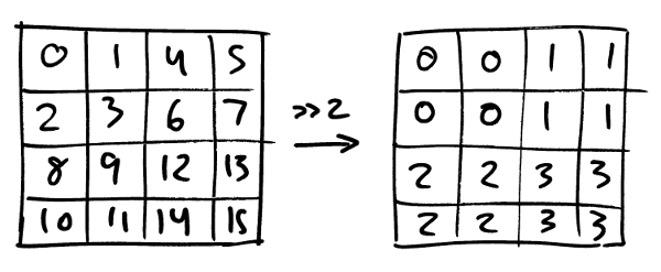 I thought: I’ll experiment a bit and see if I can’t come up with some bitwise operations that work just like dividing by 7 when the input is between 0 and 63. The one kind of division that is very cheap is by a power of 2, that’s just bit shifting. And it happens to be the case that 7 * 9 = 63, which is almost 64, a power of 2. Putting those together I got something I thought might do the trick: