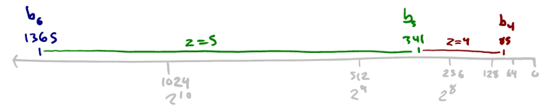 To do the rest of the computation we need a bit more intuition about how the space of quad scalars is structured. As I’ve mentioned a few times at this point, because quads are numbered in z-order within one level all the descendants of a particular quad are contiguous, and so are the scalars. That means that you can split the binary representation of a scalar into 2-bit groups where each group corresponds to a subdivision of the whole space.