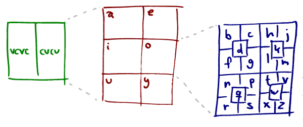 The second vowel determines a further subdivision, the second consonant narrows the quad down fully.