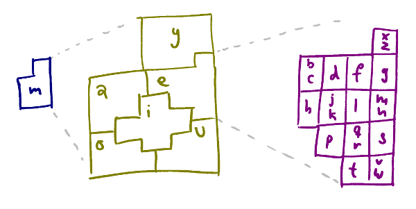 The one bit that isn’t straightforward is the scheme for encoding the zoom levels 0-6. Remember, we’re not just encoding one zoom level but 8 of them. The trick when encoding a quad at the higher levels, 0-6, is to take the quad’s midpoint and zoom it down to level 7, keeping a bit saying whether we zoomed or not. Then encode the first three letters as if it were a level 7 quad initially and finally use the zoomed/not-zoomed bit to determine the last consonant. This is why there are two consonants in some of the cells in the purple diagram for the last consonant above. This works because if you take the midpoint of a quad levels 0-z and find cell at level z+1 that contains it, no other midpoint from 0-z will land in that same cell. So it’s enough to know whether we zoomed or not, if we did then there is a unique ancestor which must be the one we zoomed from.